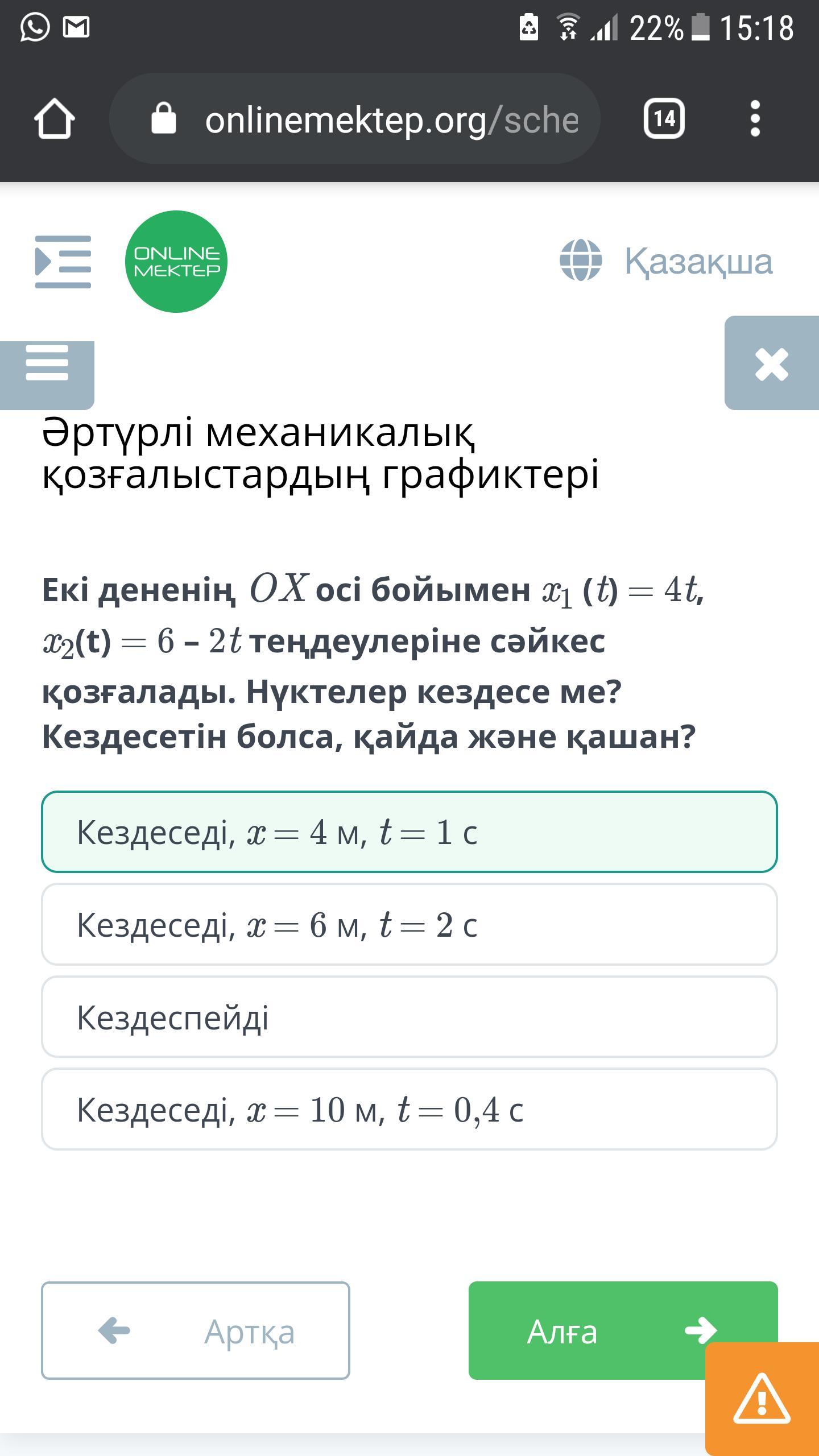 Екі дененің ОХ осі бойымен x1 (t) = 4t, Ty(t) = 6 – 2t теңдеулеріне сәйкес