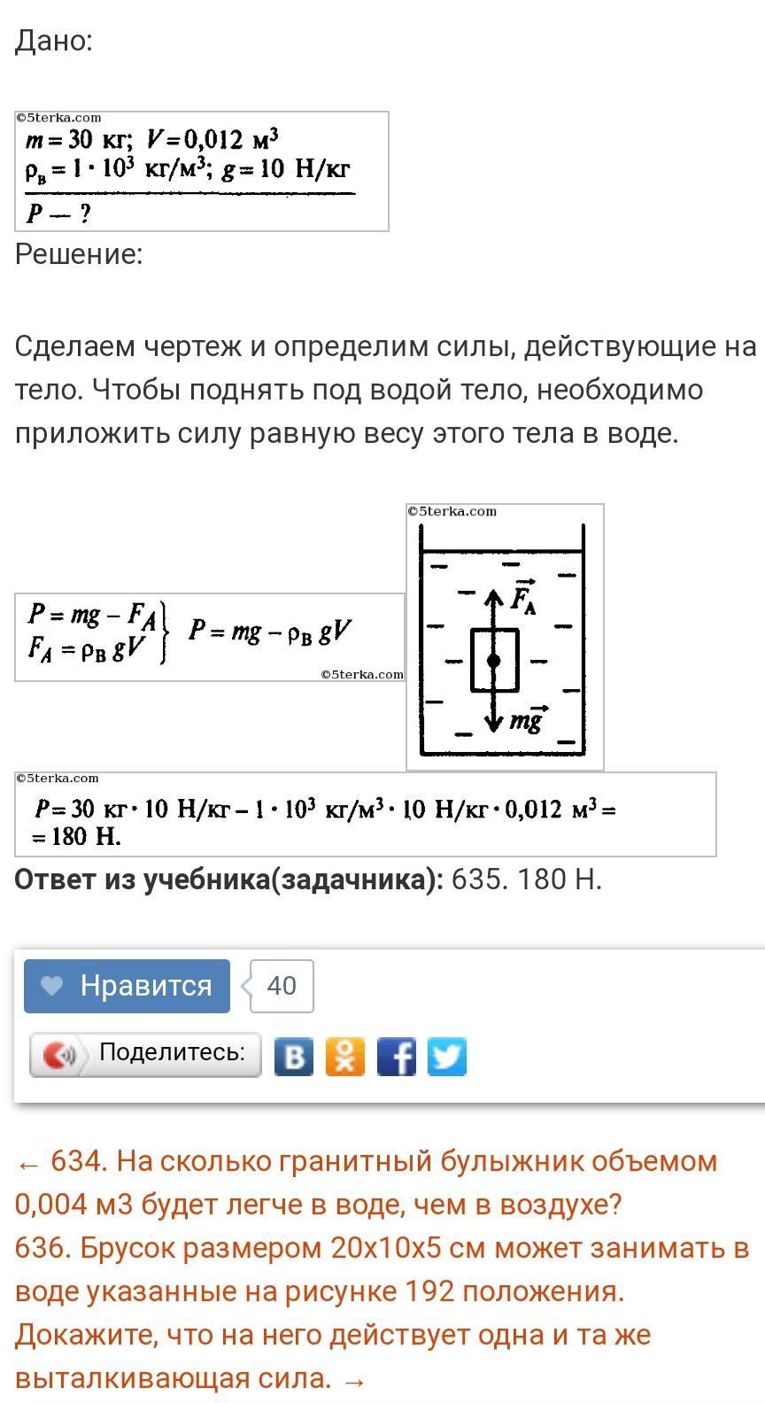 ← 634. На сколько гранитный булыжник объемом 0,004 м3 будет легче в воде, чем в воздухе?