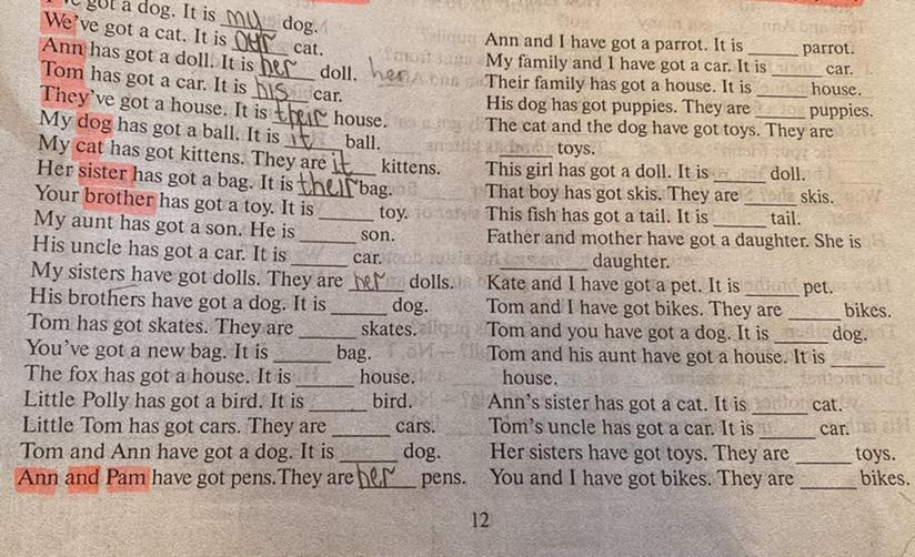 впиши в пропуск правильную форму притяжательного местоимения(my,your,his,her,it’s,our,their)