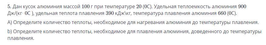 5. Дан кусок алюминия массой 100 г при температуре 20 (0С). Удельная теплоемкость алюминия 900