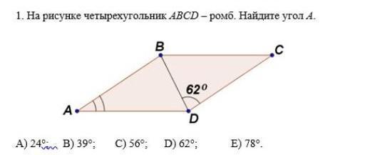 Так как ABCD ромб, а уромба все стороны равны, то верно утверждать что треугольник BCD - равнобедренный. По свойствам равнобедренного треугольника, угол BDC = угол DBC = 62°.