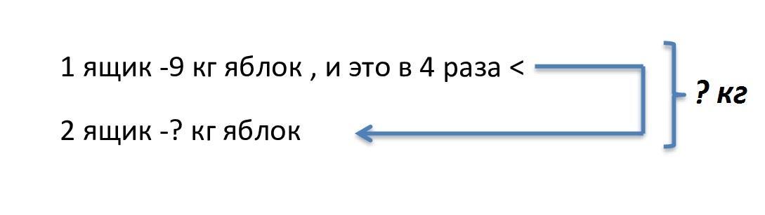В первом ящике -9 кг яблок и это в 4 раза меньше яблок , чем во втором ящике, значит во втором ящике в 4 раза больше яблок , чем в первом :