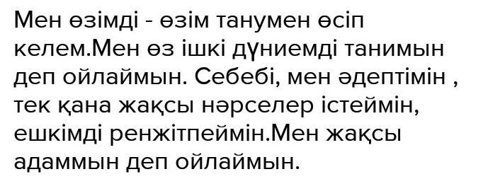 Мен өзімді өзім танумен келе жатырмын. Менің өзімнің айналамда көптеген адамдар жүреді. Олардың барлығы өте мейірімді, адал. Олармен қарым қатынаста болған өте тамаша. Олардың барлығын жақсы көремін,тіпті достарыммен, ата - аналарымды. Менің өзімнің өз тағдырым, дүнием бар. Мен ұзақ өмір сүргенді қалаймын.