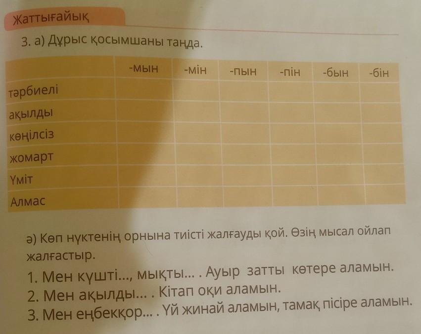 Ответ:тәрбиелімін,ақылдымын,көңілсізбін,жомартпын,Үміттің,Алмаспын