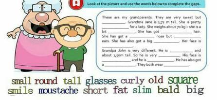 Grandpa John is very different. He is slim and about 1,50m tall. So he is very short. His face is round