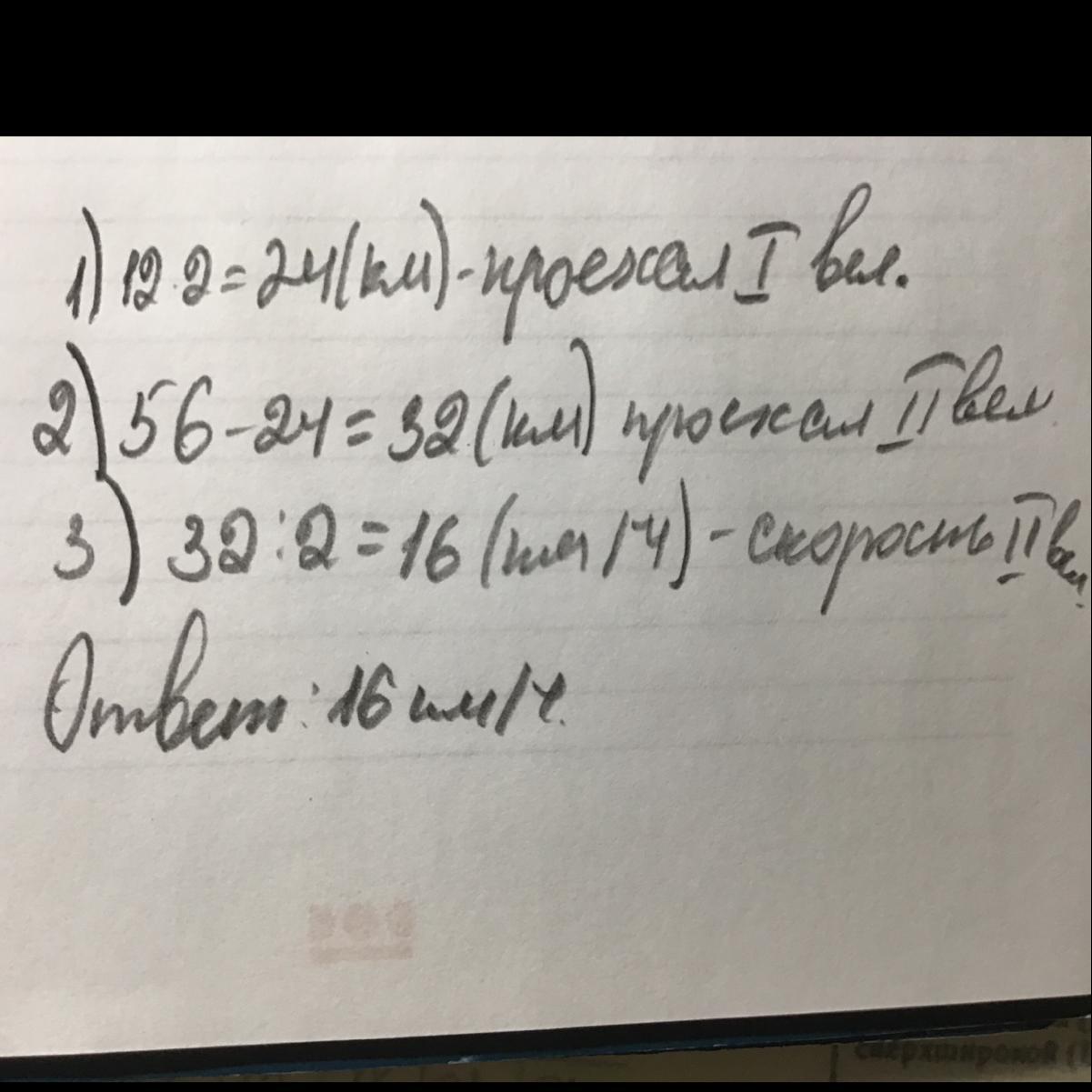 Расстояние между двумя городами 56 км Два велосипедиста выехали одновременно из этих городов навстречу друг другу и встретились через 2 часа скорость первого велосипедиста 12 км ч Чему равна скорость второго велосипедиста