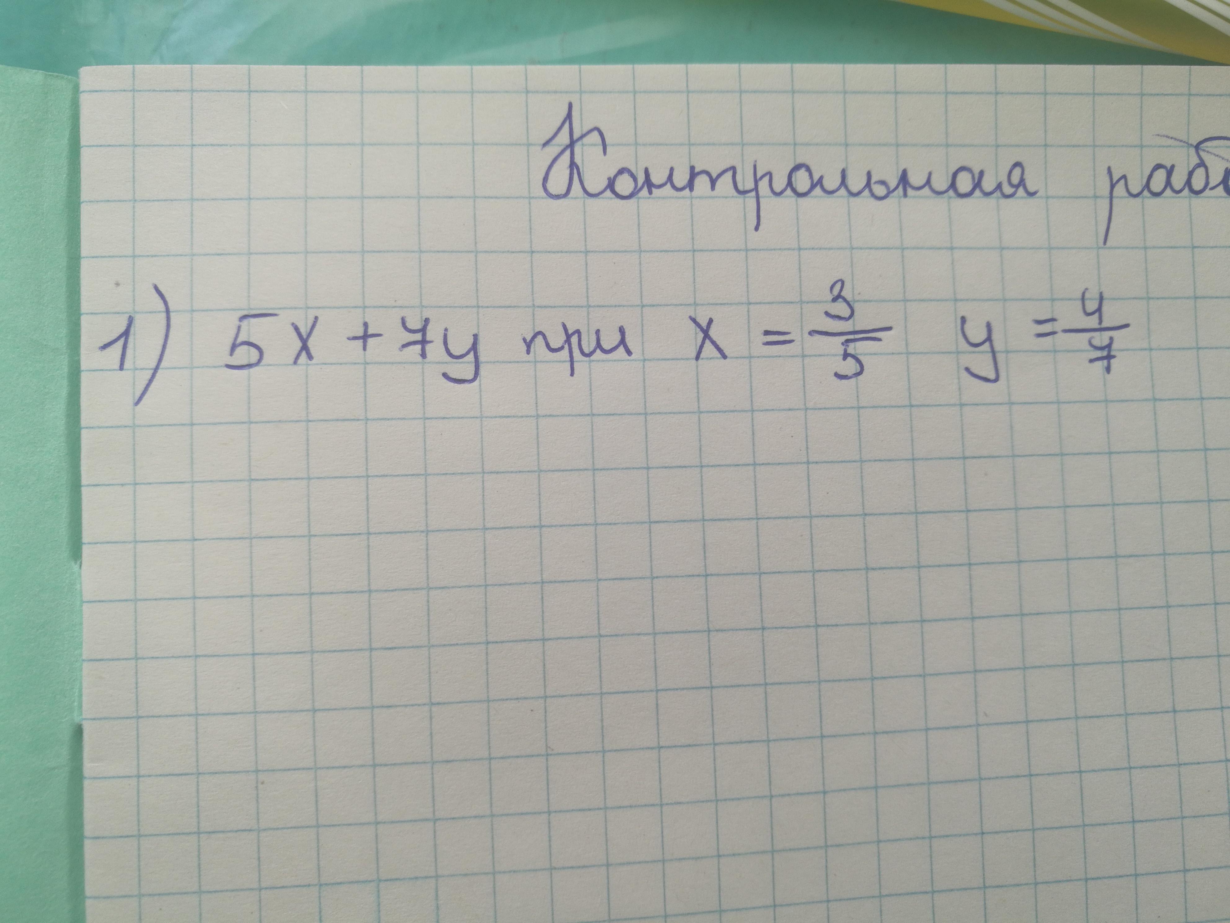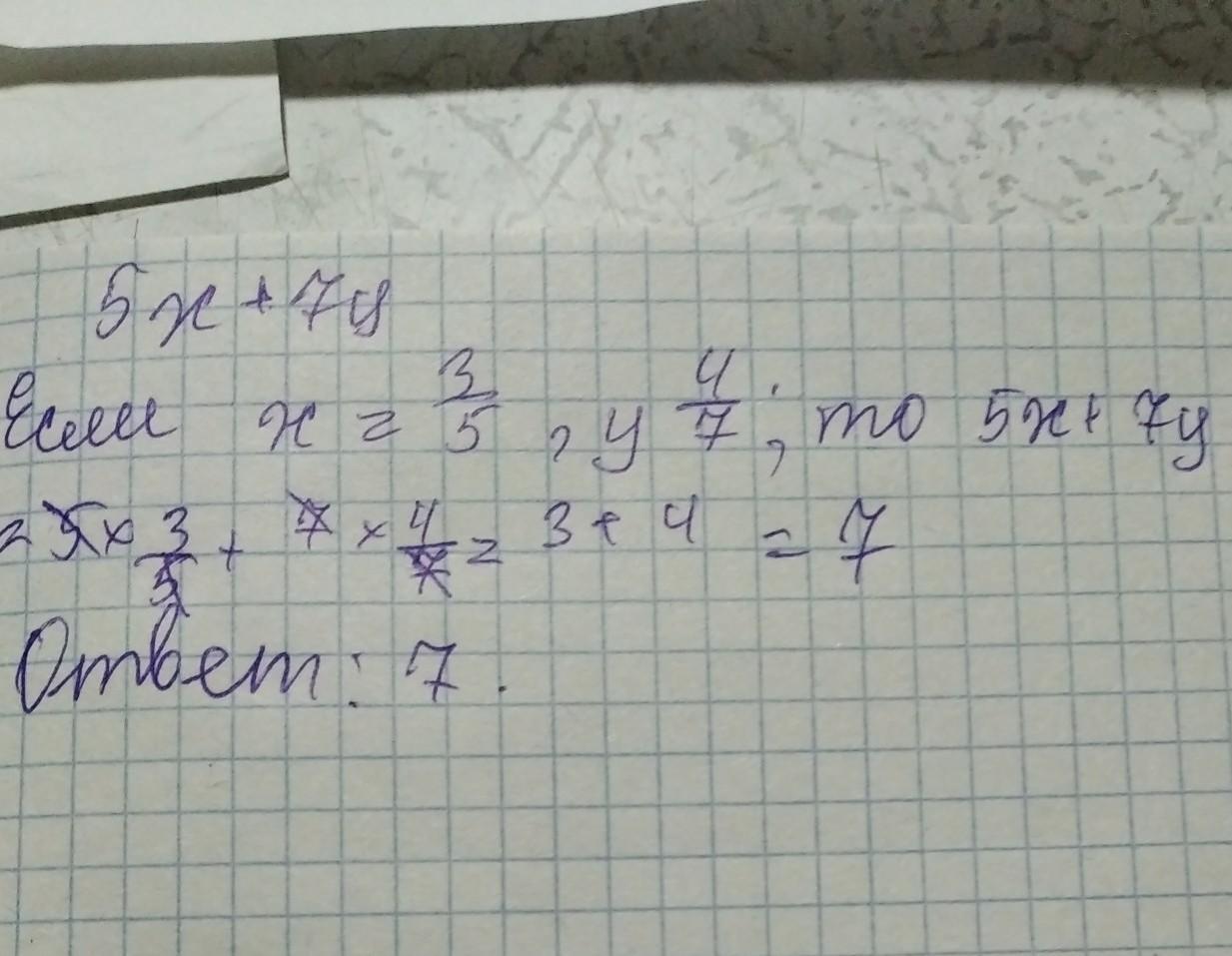 Если х=3/5, у=4/7, то 5х+7у =5*3/5+7*4/7=3+4=7