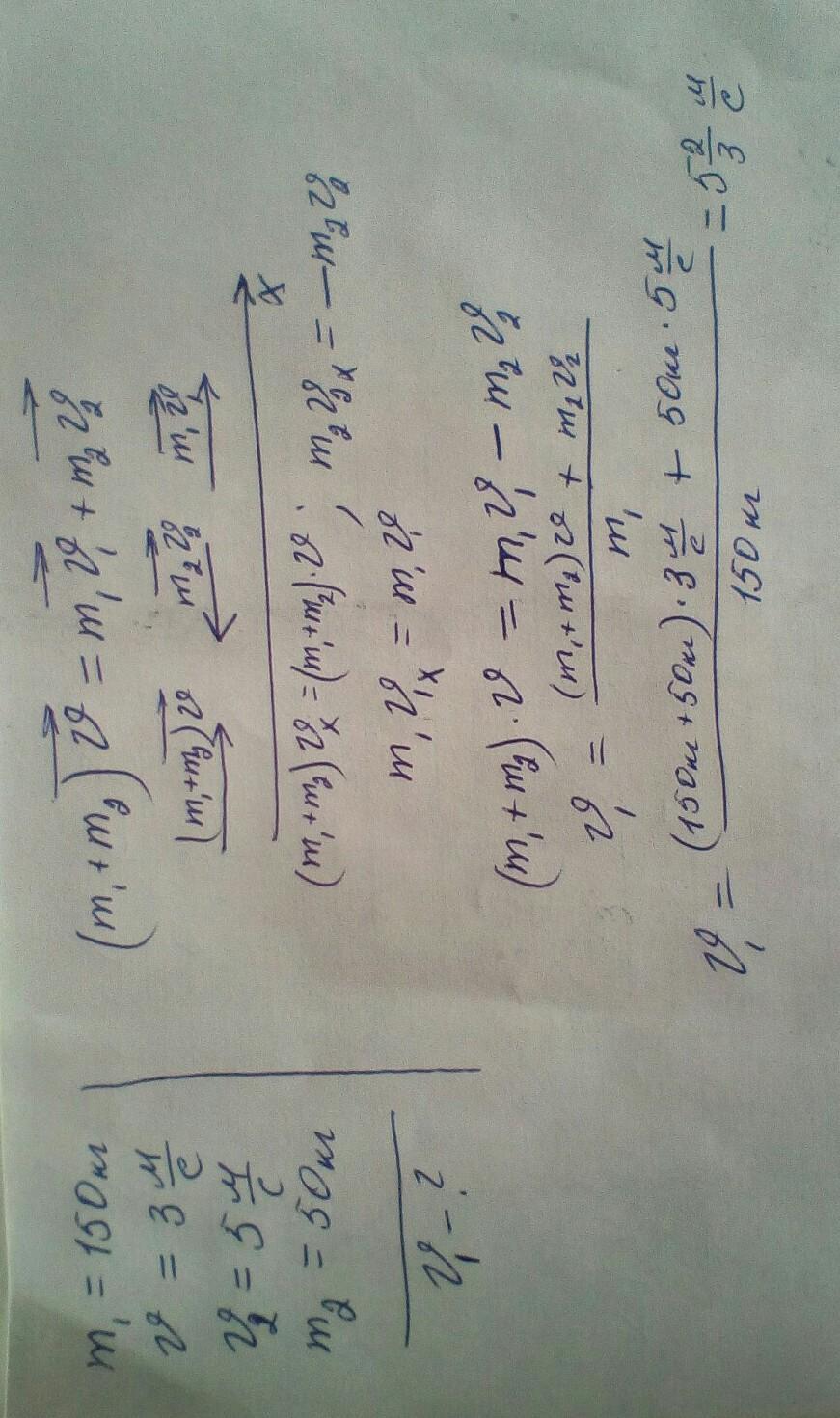 3 човна маса якого 150 кг,під час його руху із швидкістю 3 м/сек стрибнув горизонтально хлопчик із швидкістю 5м/сек у напрямі, протилежному руху човна.маса хлопчика 50 кг обчисліть швидкість руху човна в початковий момент після стрибка хлопчика
