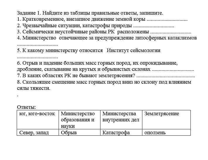 Задание 1. Найдите из таблицы правильные ответы, запишите.
