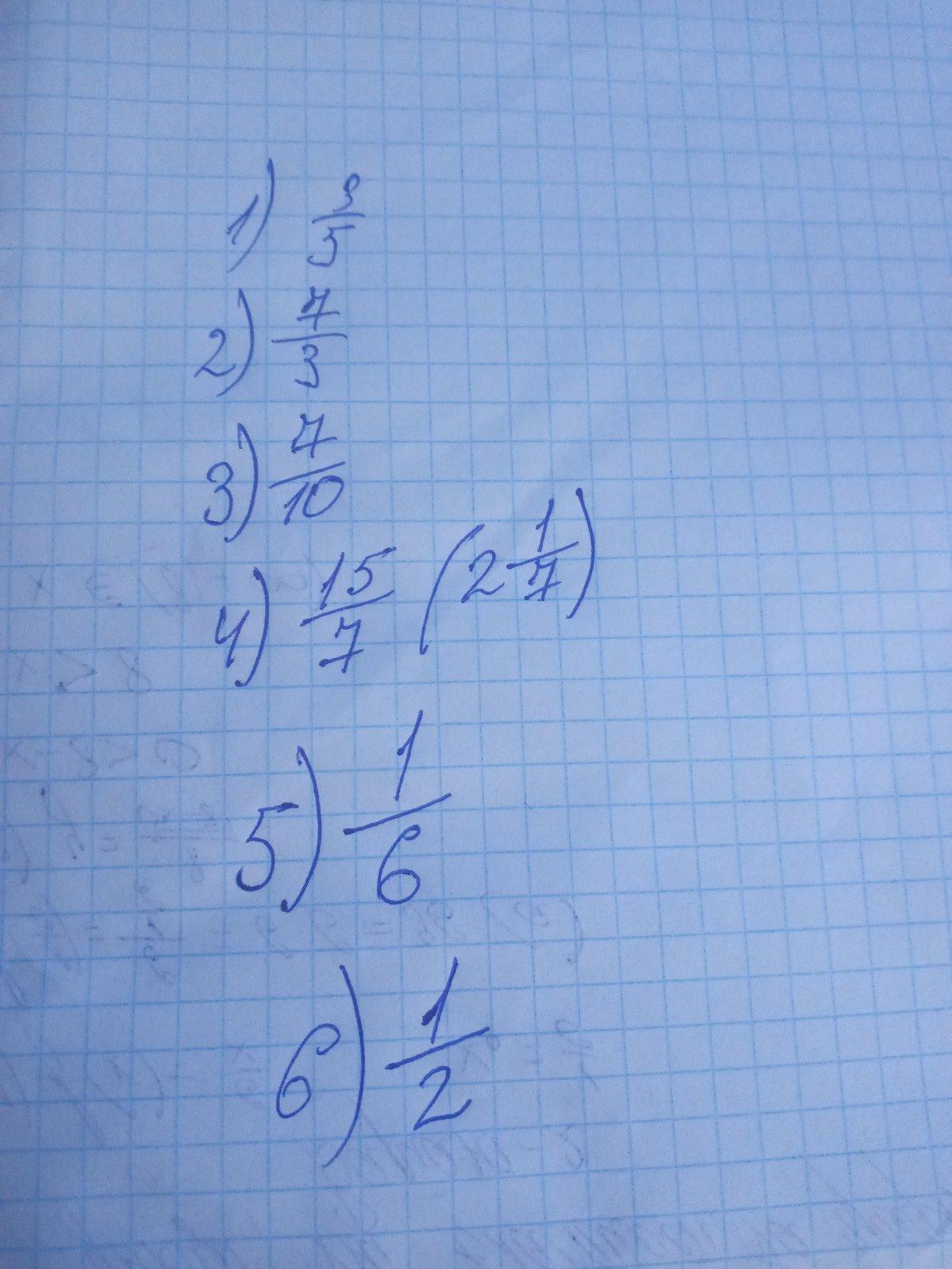 1) 3/5 2) 2 1/3. 3) 7/10 4) 2 1/7 5) 1/6. 6)1/2