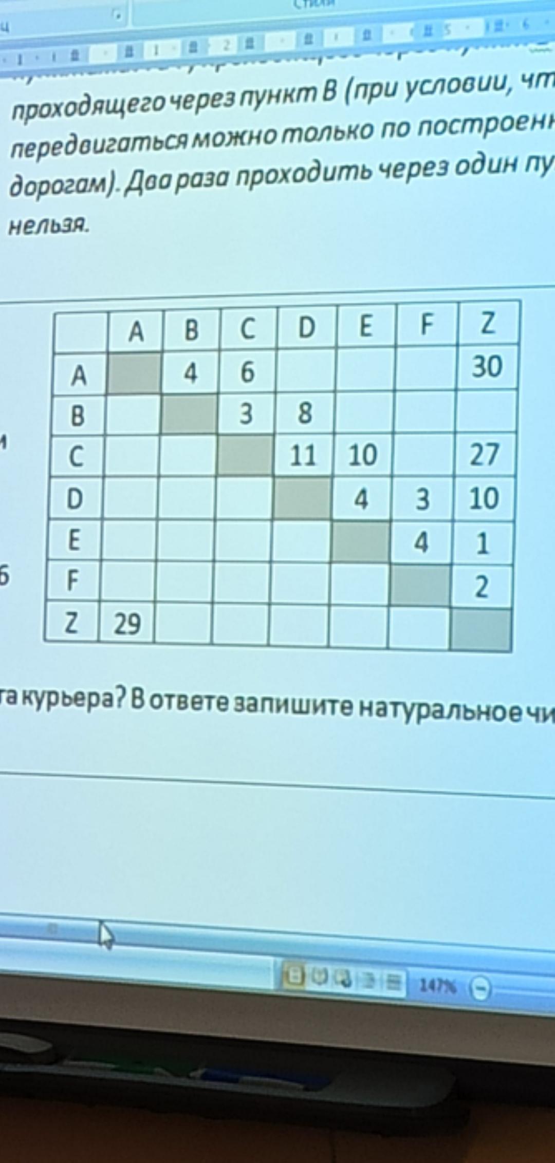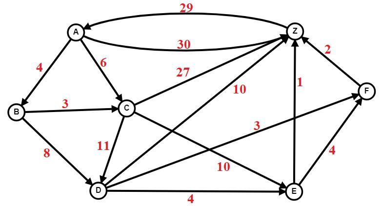 Между населёнными пунктами A, B, C, D, E, F, Z построены дороги с односторонним движением. В таблице указана протяжённость каждой дороги. Отсутствие числа в таблице означает, что прямой дороги между пунктами нет. Например, из A в B есть дорога длиной 4 км, а из B в A дороги нет.
