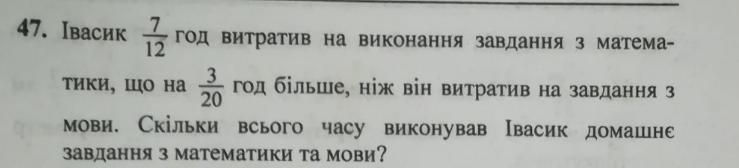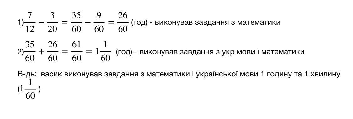 Спершу зводимо дроби до одинакових знаменників, перший дріб домножуєм на 5 а другий на 3, і віднімаємо від часу який Івасик потратив на математику час (на скільки більше він робив) і получаєм час за який він зробив укр мову. Потім додаємо час за який він зробив математику і час за який зробив укр мову