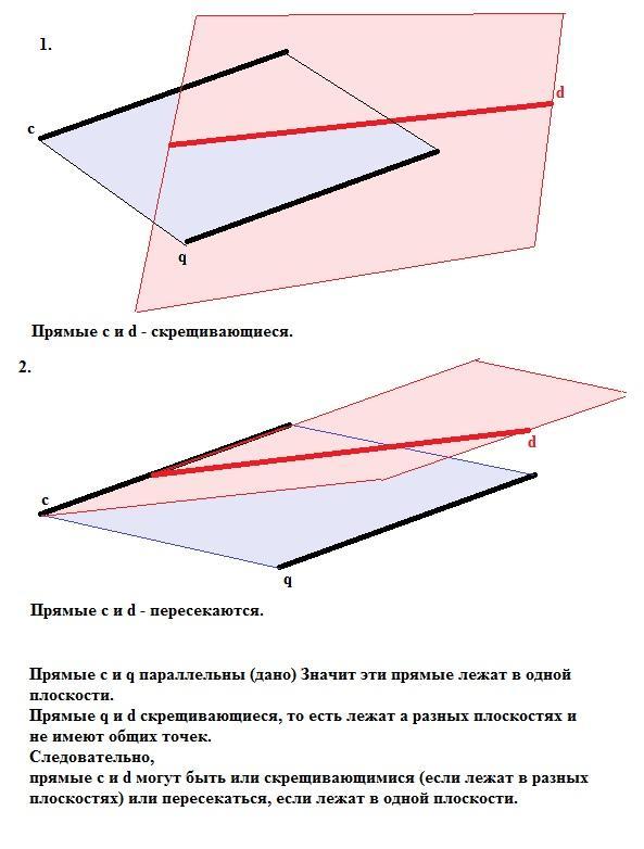 прямые с и d могут быть или скрещивающимися (если лежат в разных плоскостях) или пересекаться, если лежат в одной плоскости.