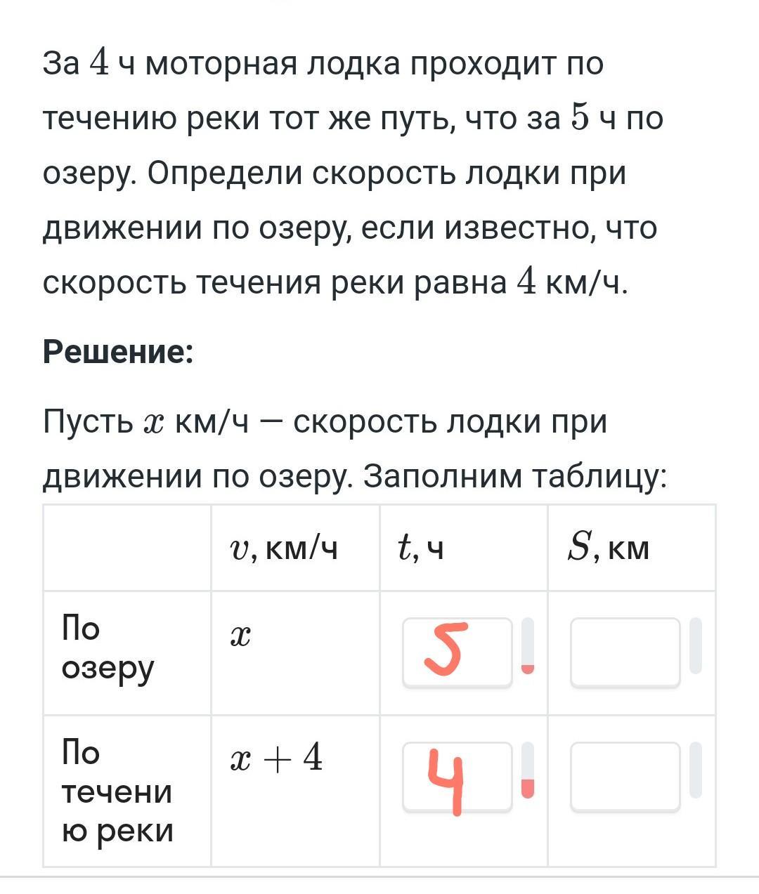 Зная x мы можем найти скорость по озеру V=x=16 км\ч и скорость по течению реки V=x+4=16+4=20 км\ч