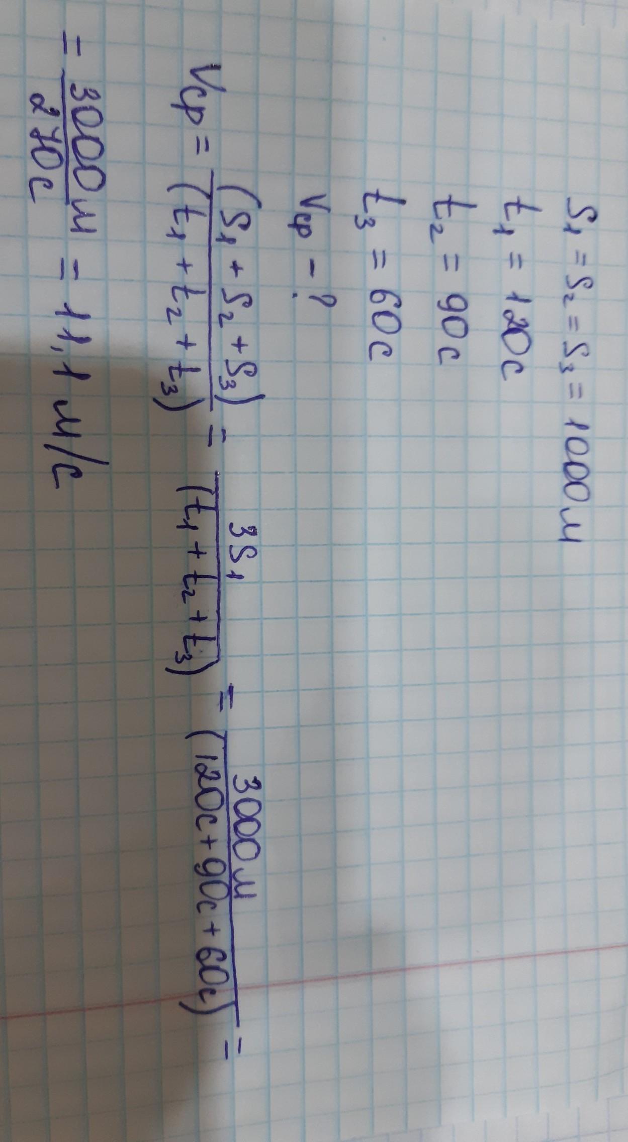 Сидя в автобусе, пассажир отмечал время прохождения автобуса между придорожными столбами, установленными через каждый километр дороги. Оказалось, что первый километр он проехал за 120 секунд, второй – за 90 секунд и третий - 60 секунд. Вычислите среднюю скорость автобуса. перевести в м/с