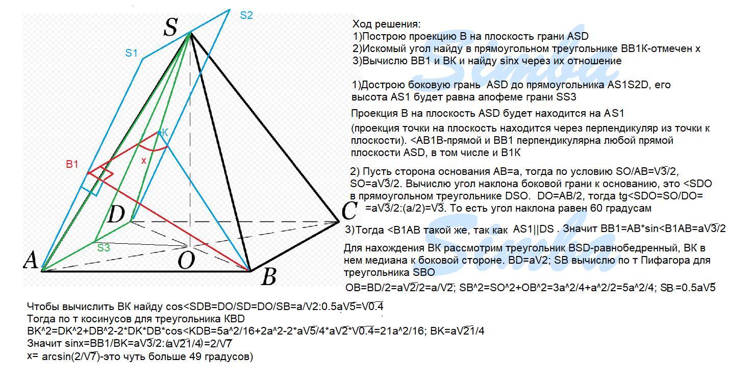 Дана правильная четырёхугольная пирамида SABCD с вершиной S. Известно, что её высота относится к стороне основания как . Найдите угол между плоскостью ASD и прямой, проходящей через точку B и середину ребра SD