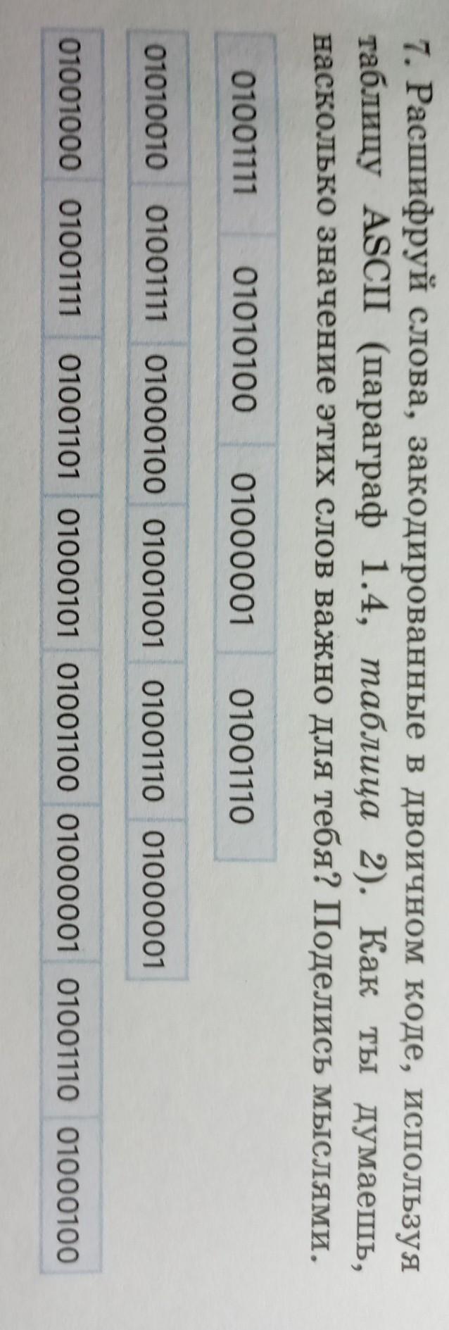 7. Расшифруй слова, закодированные в двоичном коде, используя