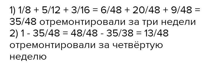 1) 1/8 + 5/12 + 3/16 = 6/48 + 20/48 + 9/48 = 35/48(дороги) за 1,2,3 недели