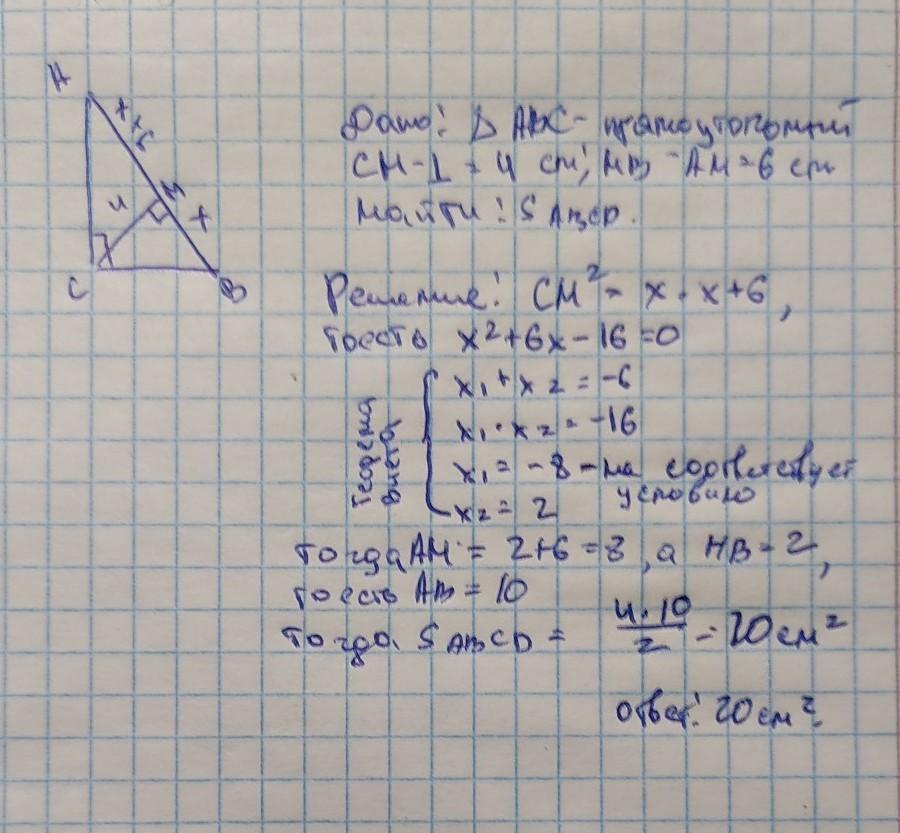 Дан прямоугольный треугольник ABC, угол C = 90°, высота СН = 4 см, HB - AH = 6 см. Найдите площадь треугольника ABC