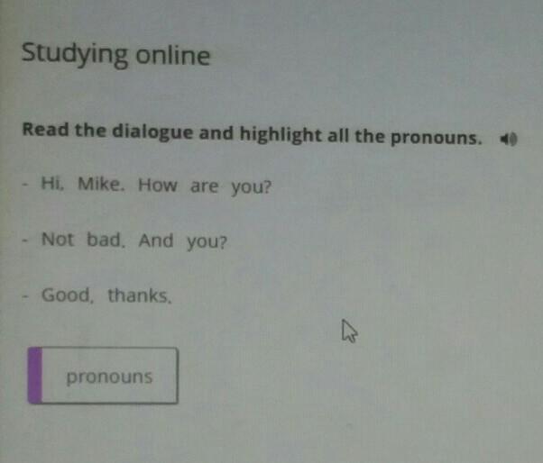 В задании требуется прочитать диалог и выделить все местоимения (pronouns). Из местоимений здесь только "ты" ("Как у тебя дела?", "А у тебя?").