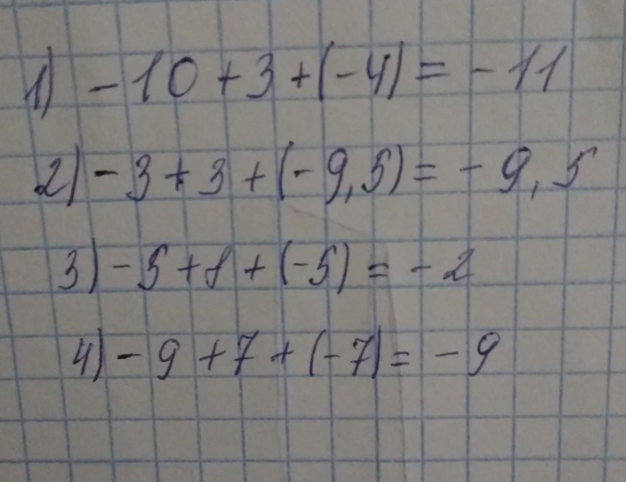 помогите пожалуйста 1) - 10 + 3 + (- 4) - 3 + 3 + (- 9, 5) ; 2) - 5 + 8 + (- 5) 4) - 9 + 7 + (- 7) .