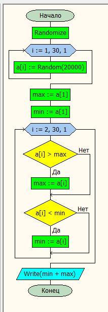 Составить алгоритм (блок схему) и написать программу нахождения суммы минимального и максимального чисел в одномерном массиве!Массив заполнен случайными числами!всего в массиве 30 элементов!