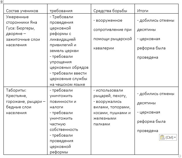Заполните таблицу : ,, Сторонники Яна Гуса