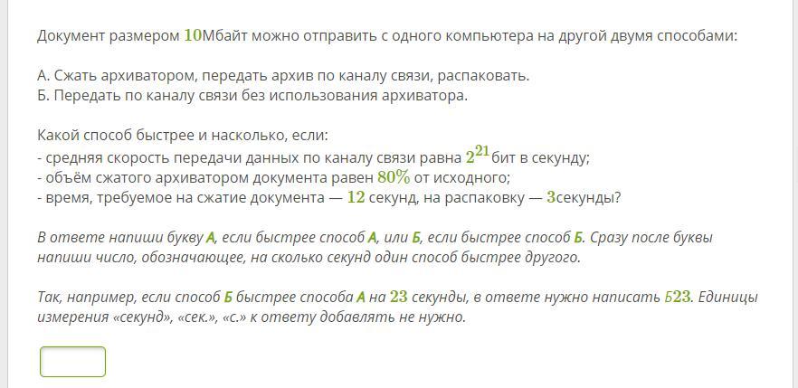 Так, например, если способ Б быстрее способа А на 23 секунды, в ответе нужно написать Б23. Единицы измерения «секунд», «сек.», «с.» к ответу добавлять не нужно.
