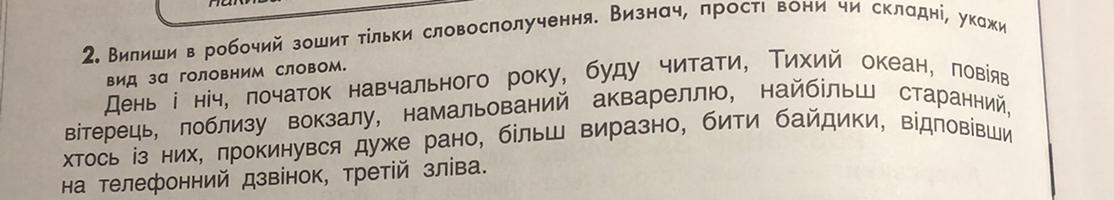Початок навчального року (складне, іменникове), поблизу вокзалу (просте, прислівникове), намальований аквареллю (просте, дієприкметникове), прокинувся дуже рано (складне, дієслівне), третій зліва (просте, числівникове).