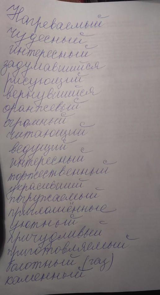 Прилагательные: чудесный, интересный, оранжевый, огромный, интересный, торжественный, уютный, причудливый, болотный (газ), каменный.