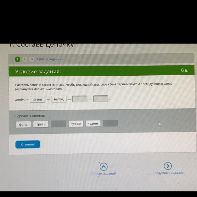Денёк - кузов - выход (т) - трель (ль) - ледник