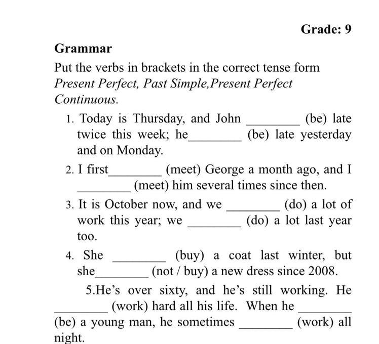 1. Today is Thursday, and John has been late twice this week; he was late yesterday and on Monday. 2. I first met George a month ago, and I have met him several times since then. 3. It is October now, and we have done a lot of work this year; we did a lot last year too. 4. She bought a coat last winter, but she hasn't bought a new dress since 2008. 5. It’s only the middle of the month, and he has already most of his salary; he spent $60 yesterday, 6. I broke my leg in 1991, but I have never broken my arm. 7. He’s over sixty, and he’s still working. He has been working hard all his life. When he was a young man, he sometimes worked all night.