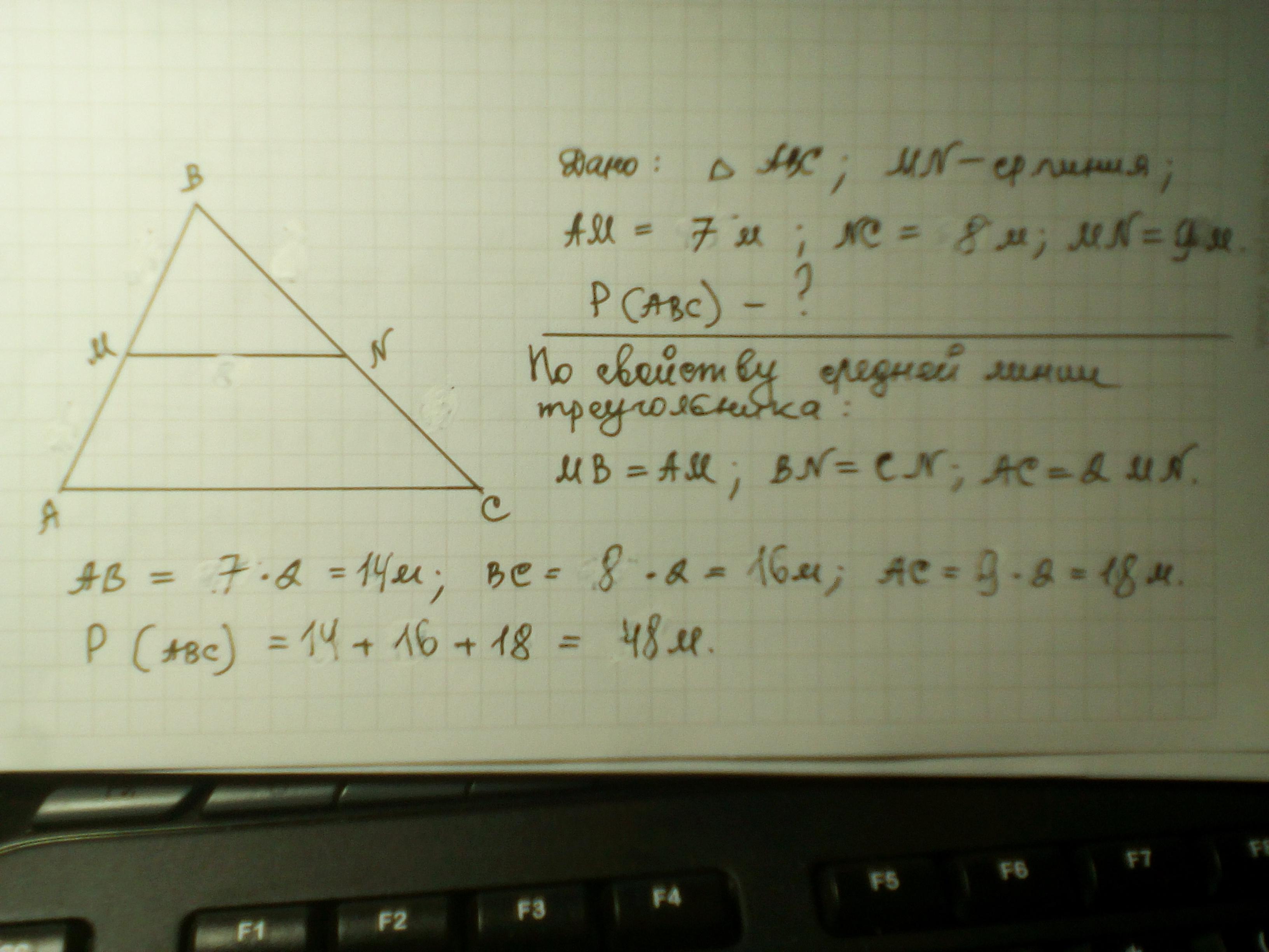 Средняя линия треугольника АВС отсекает от него трапецию АMNC с боковыми сторонами 7 м и 8 м и меньшим основанием 9 м. Найдите периметр треугольника ABC.