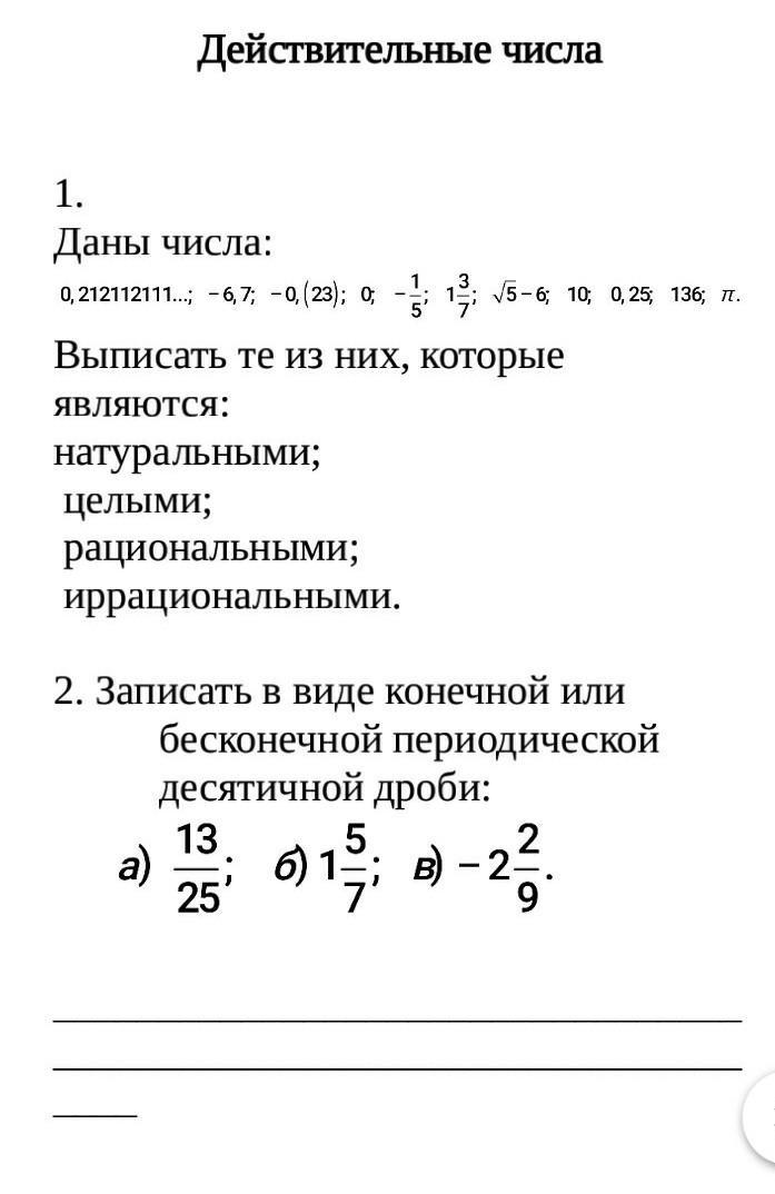 1) 10; 0,25; 136; 1 3/7; √5-6; 0,212112111...; п