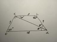 Дано: ОКLМ - трапеция, КO=LM=9 см, ∠К=∠L=120°. Найти МO, КL.