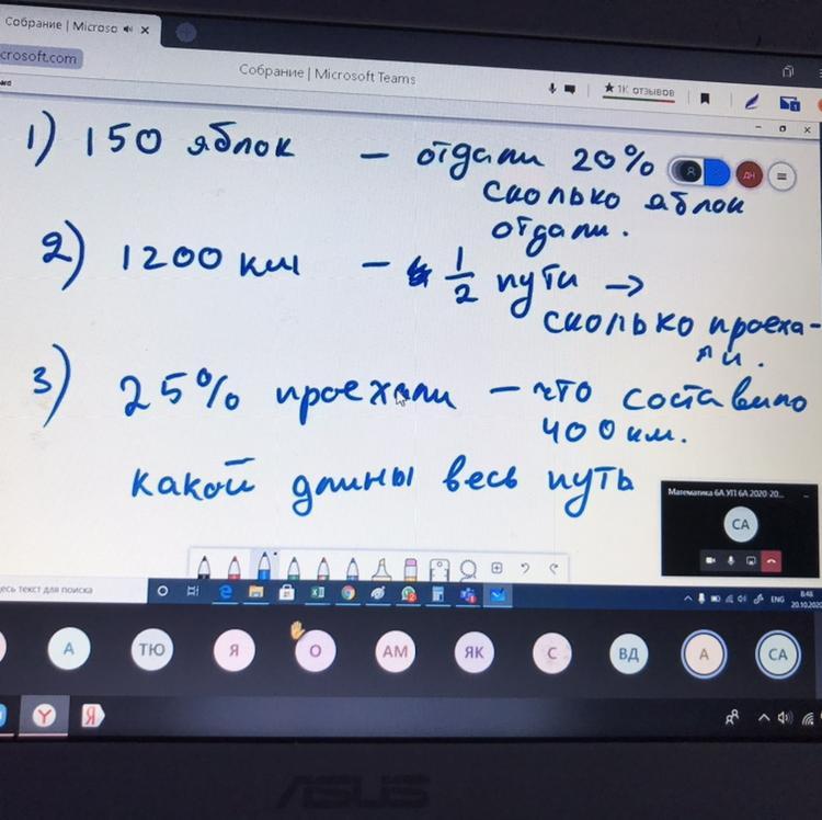1) 150 яблок - отдали 20% сколько яблок отдали?