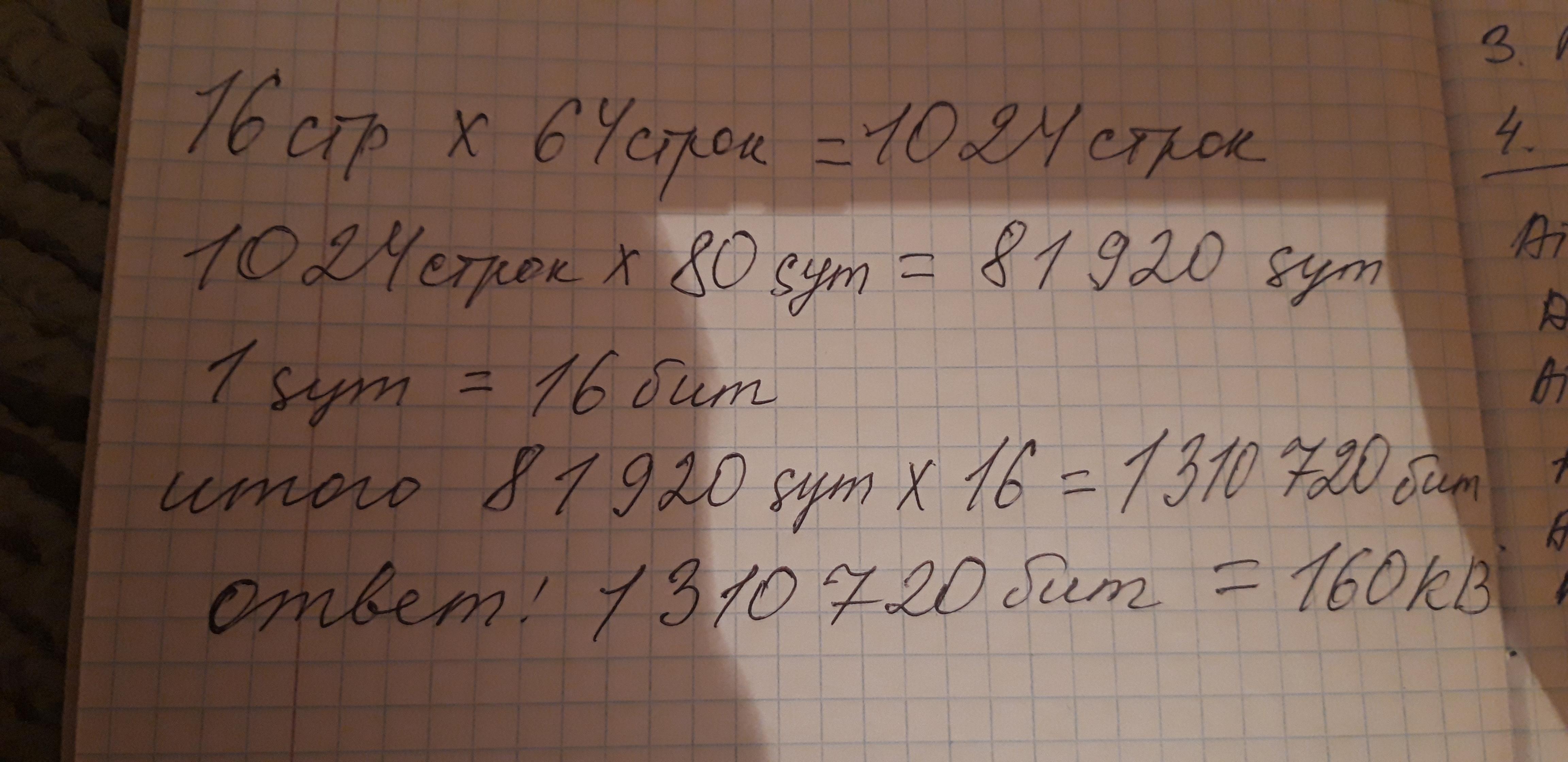 1) Рассказ, набранный на компьютере, содержит 16 страниц, на каждой странице 64 строк, в каждой строке 80=16*5 символов. Определите информационный объём рассказа в Кбайтах в кодировке Windows, в которой каждый символ кодируется 16 бит.