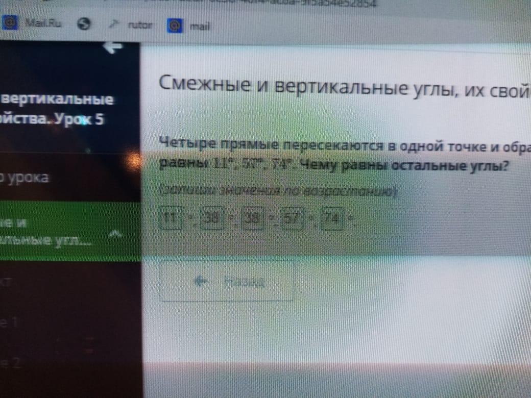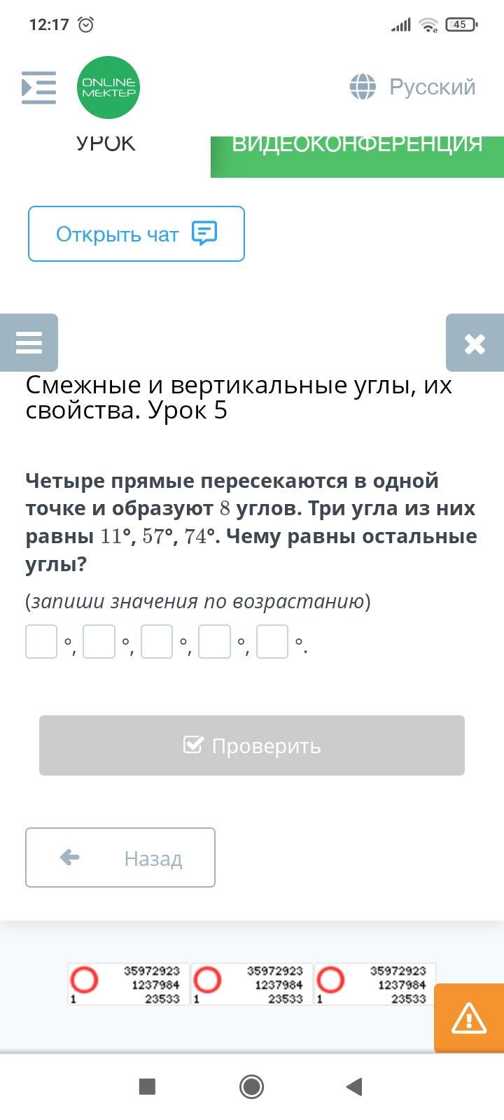 Срочно помогите пж.Четыре прямые пересекаются в одной точке и образуют 8 углов. Три угла из них равны 11°, 57°, 74°. Чему равны остальные углы?
