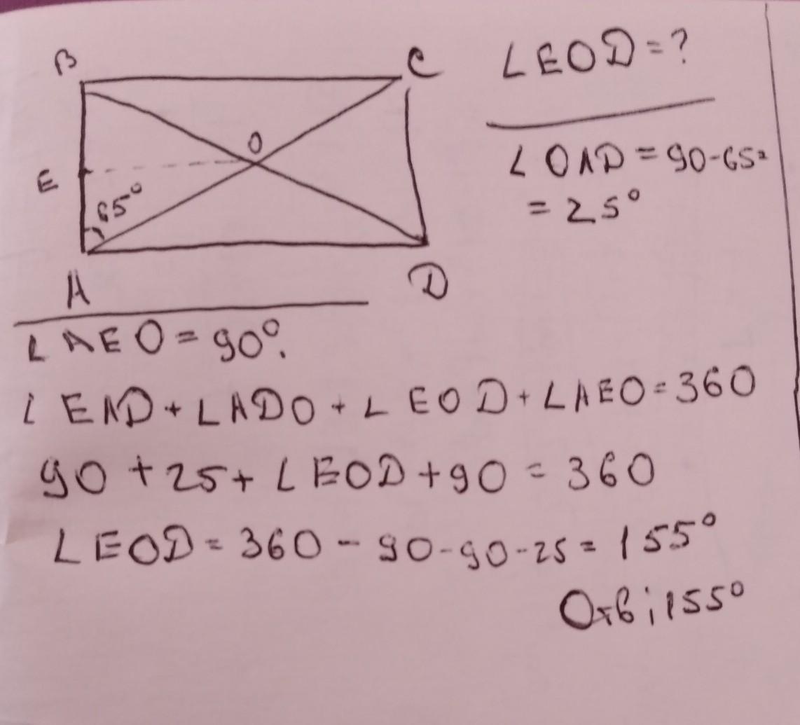 В прямоугольнике ABCD диагонали пересекаются в точке О, точка E - середина стороны AB, угол BAC равен 65 градусов. Найти угол EOD
