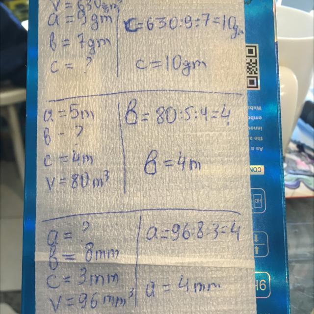 а-9дм,b-7дм,с-?,v-630дм в куб. а-5 м, b-?с-4м,v-80мв куб . а-?b-8мм,с-3 мм,b-96мм помогите решить