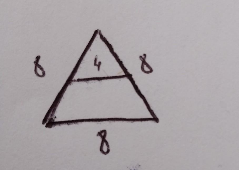 так как средняя линия треугольника равна половине основания, основание равно 2*4=8 см. так как треугольник равносторонний, периметр равен 8+8+8=24 см