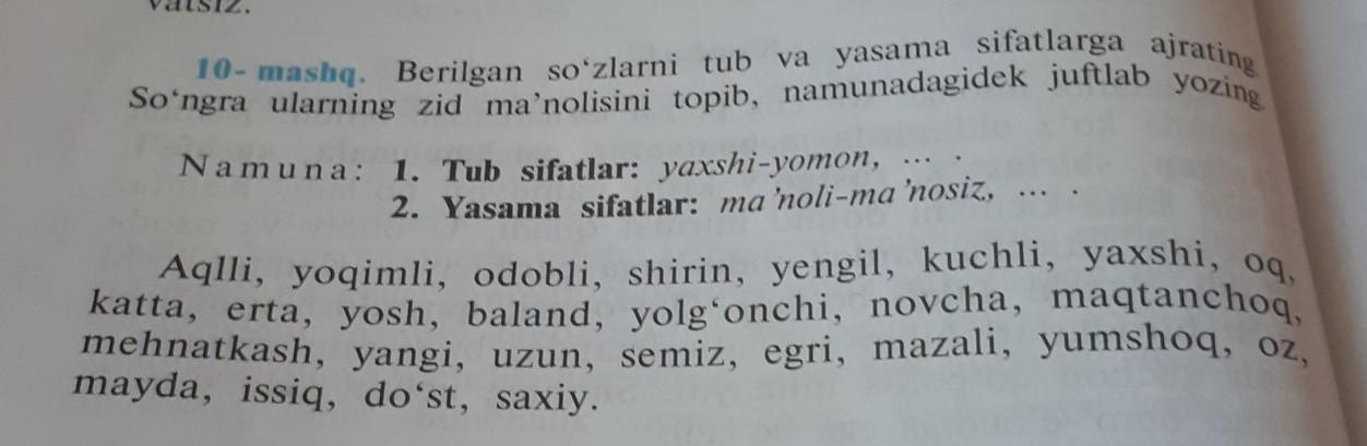 Tub sifatlar:shirin-achchiq,yengil-oğir, yaxshi-yomon, oq-qora, katta-kichik, erta-kech, yosh-qari, baland-past, yolğonchi-rostgõy, novcha-semiz, maqtanchoq-kamtar, mehnatkash-dangasa, yangi-eski, uzun-qisqa, semiz-ozğin, egri-tõğri, mazali-achchiq, yumshoq-qattiq, oz-kõp, mayda-yirik, issiq-sõvuq, dõst-dushman, saxiy-baxil.