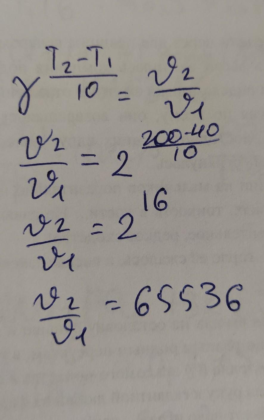 Во сколько раз увеличится скорость реакции при повышении температуры от 40 до 200 ℃, если принять, что температурный коэффициент скорости равен 2?