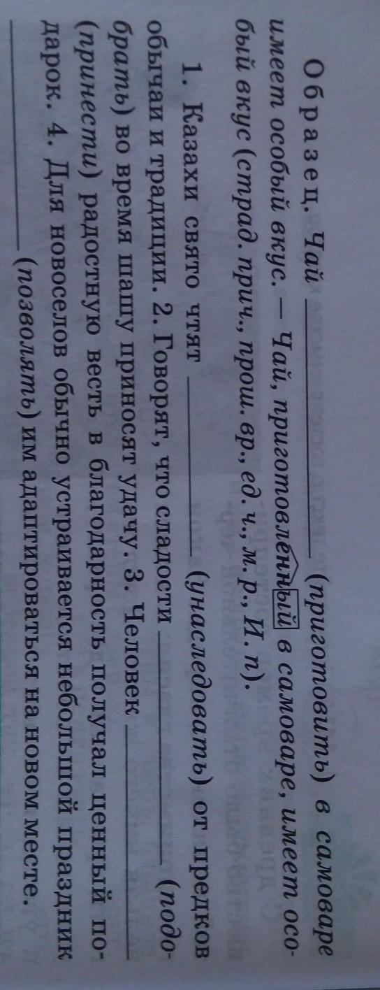 казахи свято чтят унаследованные(какие?) от предков обычаи и традиции.(страдательное причастие, прош. вр., мн. ч., в. п) говорят, что сладости, подобранные(какие?) во время шашу, приносят удачу.(страдательное причастие, прош.вр., мн.ч., им.п) человек, принесший(какой?) радостную весть, в благодарность получал ценный подарок.(действительное причастие, прош.вр., ед.ч., м.р., им.п.) для новоселов обычно устраивается небольшой праздник, позволяющий(какой?) им адаптироваться на новом месте.(действительное причастие, наст. вр., ед. ч., м.р., им. п.)