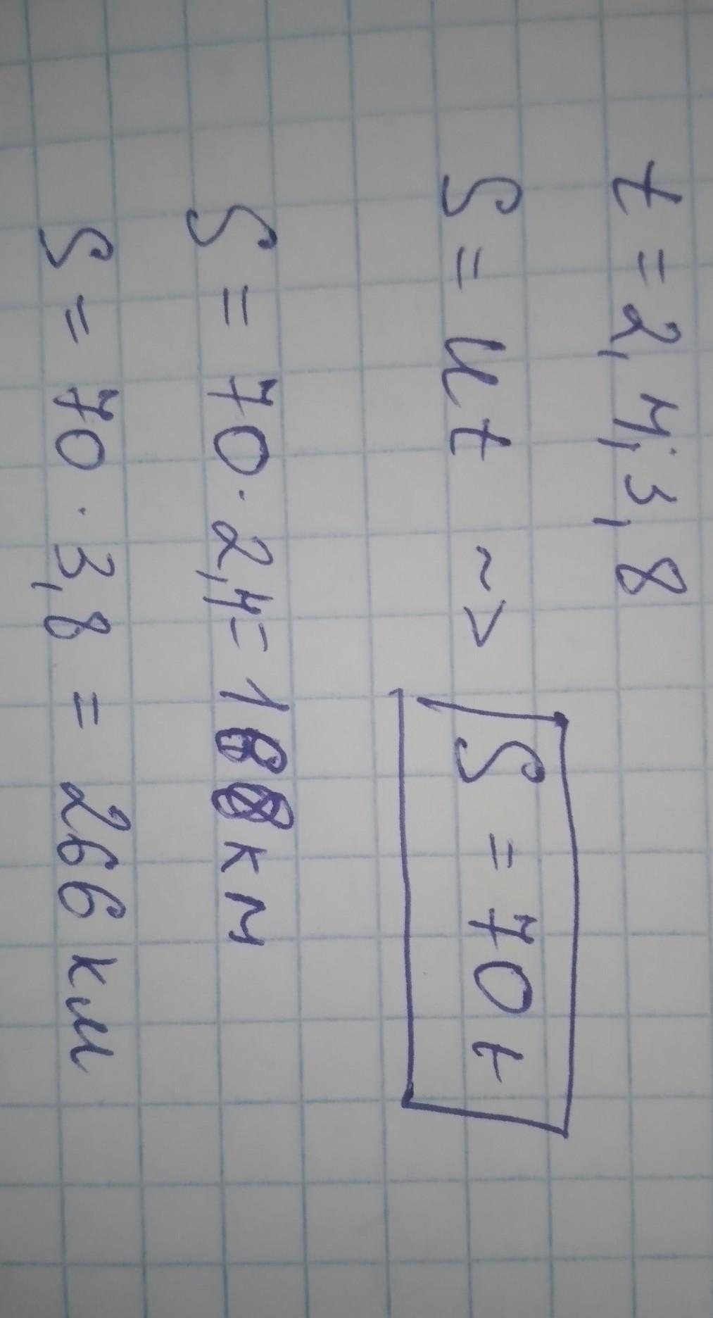 Поезд,двигаясь со скоростью 70 км/ч,проходит за t ч расстояние s км.Задайте формулой зависимость s от t.Найдите значение функции,соответствующее значению аргумента,равному 2,4;3,8.