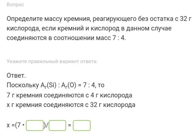 Химия 8 класс. Определите массу кремния, реагирующего без остатка с 32 г кислорода, если кремний и кислород в данном случае соединяются в соотношении масс 7 : 4.