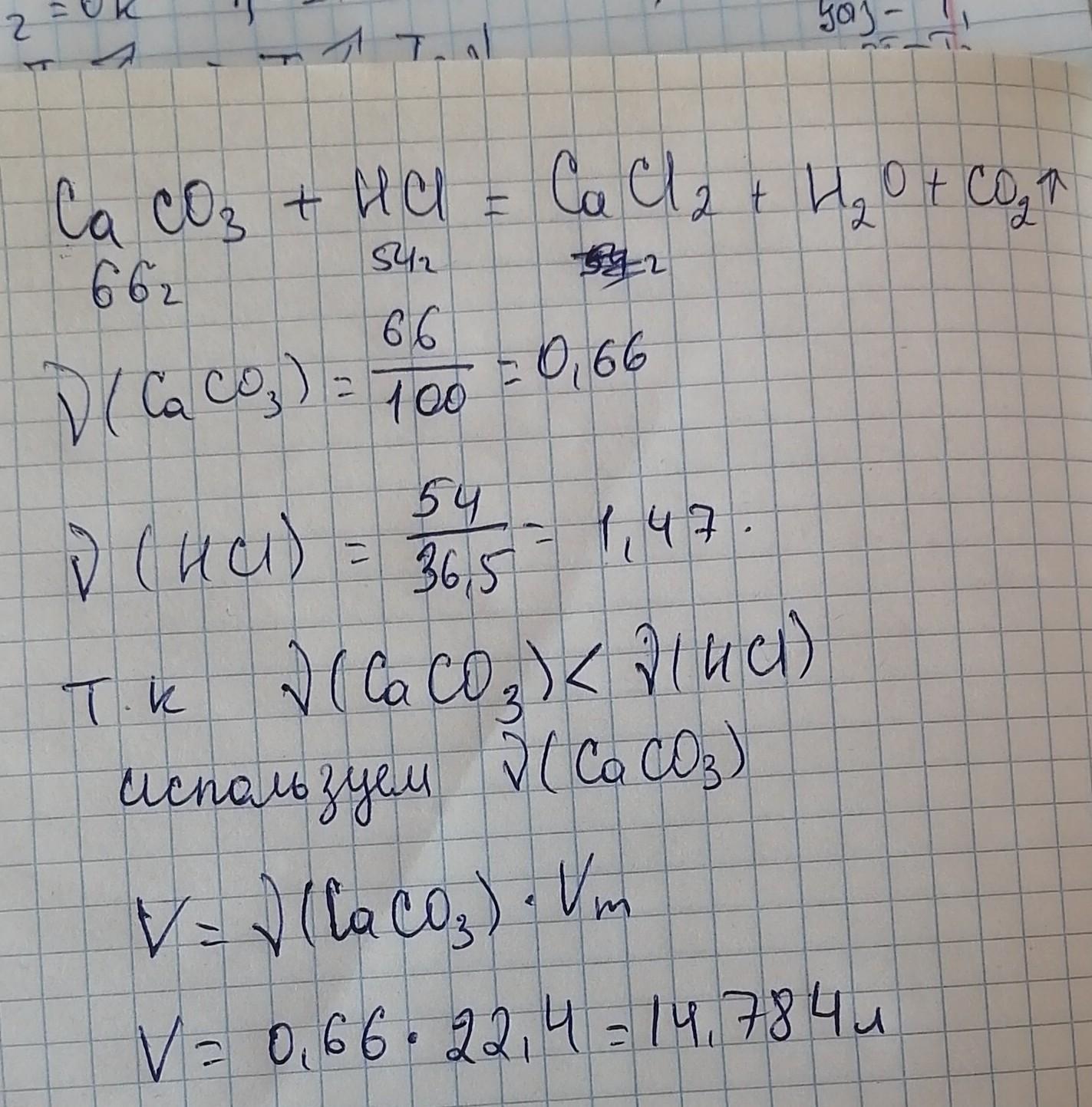 СРОЧНО ПОМОГИТЕ ПОЖАЛУЙСТА ! При взаимодействии 66 г карбоната кальция с 54 г соляной кислоты образовался газ. Вычислите объем, образовавшегося газа