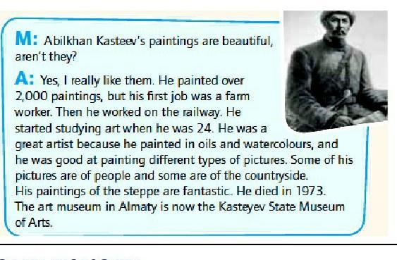 О: Да, они мне очень нравятся. Он написал более 2000 картин, но его первой работой был сельскохозяйственный рабочий. Потом работал на железной дороге. Он начал изучать искусство, когда ему было 24 года. Он был великим художником, потому что рисовал маслом и акварелью, и он хорошо рисовал разные типы картин. Некоторые из его фотографий изображают людей, а некоторые - деревню. Его картины степи фантастичны. Он умер в 1973 году. Художественный музей в Алматы сейчас Государственный музей искусств имени Кастеева.