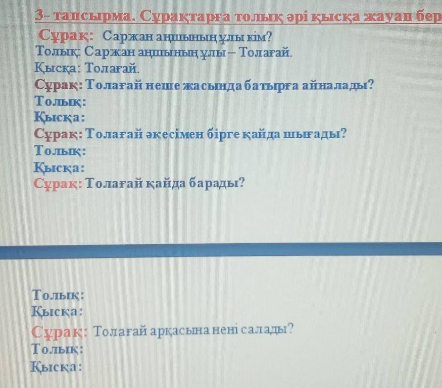 3- тапсырма. Сұрақтарға толық әрі қысқа жауап беріңдер.