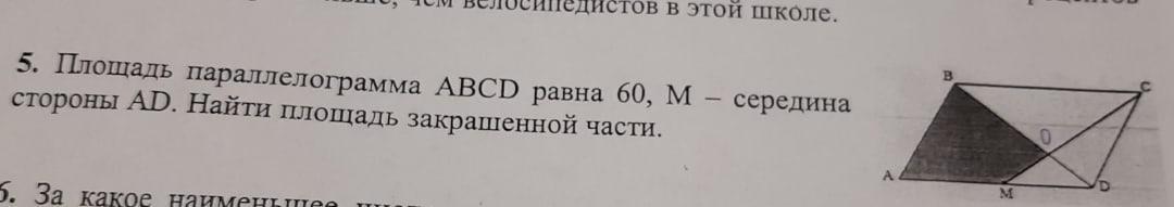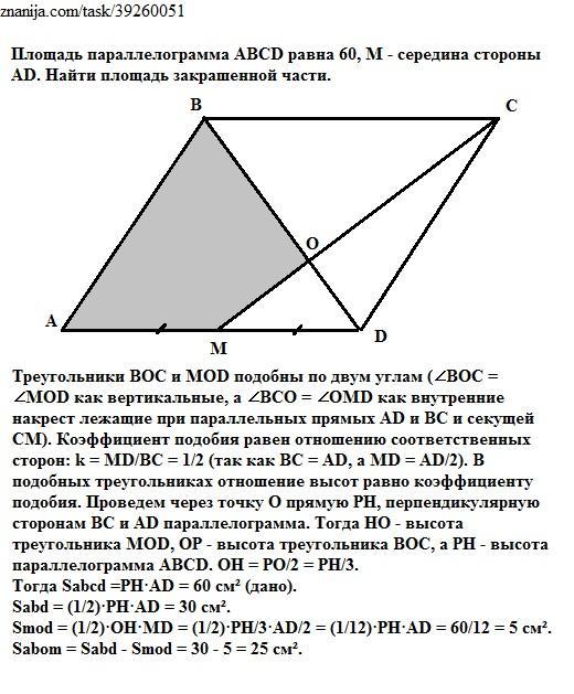 Помогите решить задние по геометрии! Площадь параллелограмма ABCD равна 60, M - середина стороны AD. Найти площадь закрашенной части.